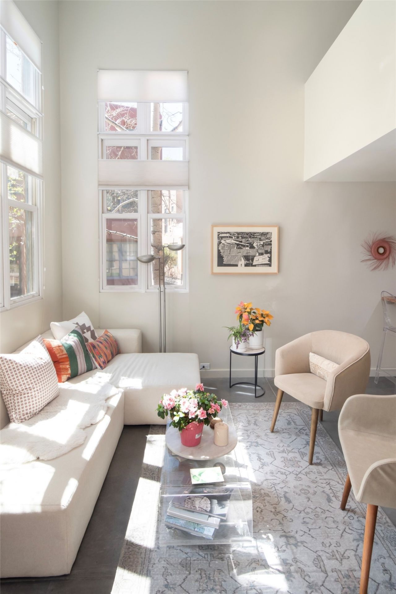 Located within the landscaped interior of the Lofts at Marquez Place, this bright and thoughtfully designed condo offers a unique blend of privacy, flexibility, and convenience. With a ground-level entrance and no unit above, the space lives quietly and comfortably. A rare highlight is the private, walled courtyard, ideal for outdoor living, pets, or a separate entrance for live/work use. Inside, the layout is both functional and distinctive. The kitchen is arranged in two connected areas, with additional storage and prep space tucked away, while a custom live-edge cherry and sapele wood counter by Boxcar Woody anchors the main living area. Stairs lead to the lofted sleeping space, with built-in storage below. The primary bedroom is located on the main level, with direct access to the courtyard and an adjacent bath. Zoned C-2, with short-term rentals permitted pursuant to the condominium declaration, the property offers flexibility for residential, creative, or professional use. All of this is just minutes from the Railyard, downtown, restaurants, and shopping, making it a well-located option for those seeking both convenience and versatility in Santa Fe.