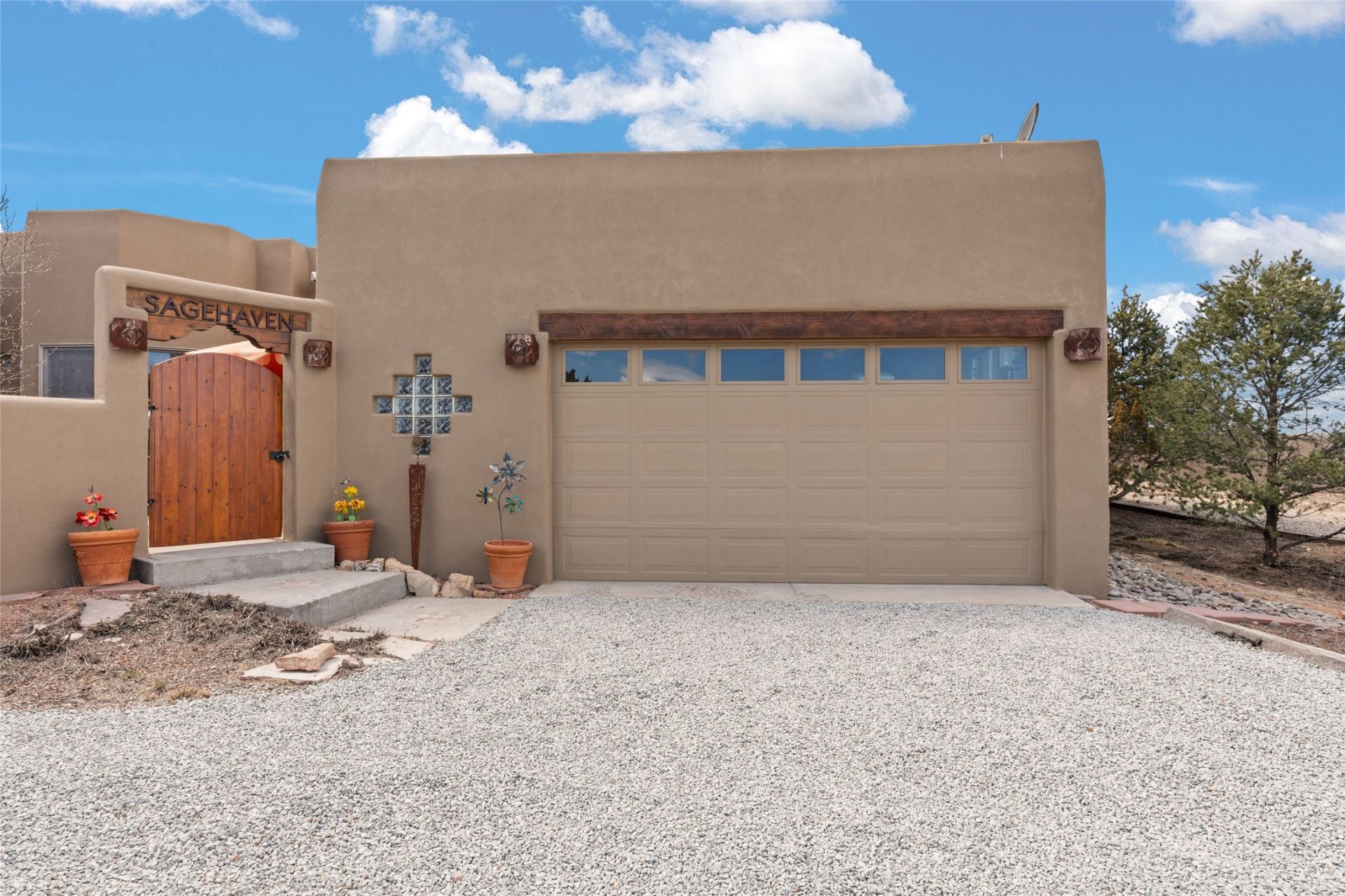 Beautifully maintained and well loved, this 2,460+/- sq ft 3 bedroom home sits on 2.5 acres with great light, gorgeous Sangre de Cristo views and is handy to walking and biking trails which run behind the back patio and go all the way to BLM land. Entering through an enclosed front patio to the entry hall, the house opens to a lovely open main living area with high wood/viga ceilings, wood burning fireplace and access to the private, walled back patio facing South and West for sunny enjoyment even on a cool day. The dining room also opens to a covered back patio for grilling and al fresco dining; and both living areas are open to a most wonderful kitchen. The kitchen has plenty of storage, granite counters, gas stove and a delightful eating nook to enjoy the morning sun and Sangre views. The kitchen also has a fabulous bar/counter area so that the cook can hang with friends and family while preparing a meal ? no crowded kitchen here! Perfect bedroom separation with the primary enjoying a fireplace, walk in California closet, access to the walled patio with cool inflatable hot tub and an ensuite bath with jacuzzi tub, nice sized shower and double sinks. The two guest rooms are on the other side of the home, and share a good-sized bath, also with two sinks. Through the laundry room is a bonus room with a new mini split for heating and cooling and a separate entry ? this would make a great studio, home office, game room or easy casita conversion as it is stubbed in for kitchenette and or bath. For easy direct access with groceries is a two-car garage, with an attached storage room suitable for storing multiple bikes and outdoor equipment. New stucco in 2023, new roof in 2019 with transferable warranty, and a radon mitigation system in place. There is an entirely new domestic water supply plumbing installed in June of 2025 with five year warranty; along with new 4 ton package for a forced air heating and AC system. A Moen Flo smart water monitoring, leak detection and water shut off system installed also in June of 2025.